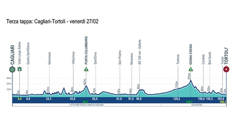 Terza giornata di gara al Giro di Sardegna: in programma oggi c'è la Cagliari – Tortolì di 168, 3 km. Con un dislivello complessivo di 1.190 metri, la frazione odierna si annuncia come la meno impegnativa dal punto di vista altimetrico....