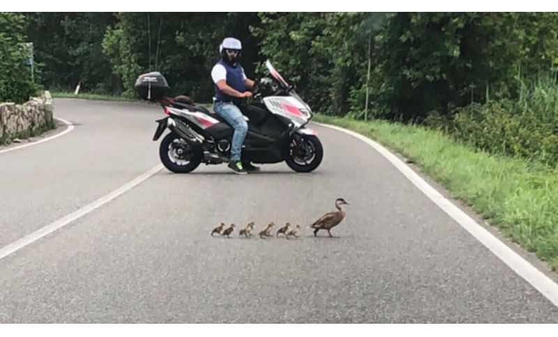 Lungo le strade del Giro d'Italia succede anche questo. Ieri il gruppo ha incontrato mamma papera con i suoi piccoli che attraversava la carreggiata affrontata dai corridori della corsa rosa giovani. Per proteggere atleti e animali e far sì che tutto si svolgesse in sicurezza, è intervenuto Federico Roganti, prezioso inviato in moto del servizio Radio Informazioni della Federazione Ciclistica Italiana. Ad immortalare il suo gesto "eroico" dall'ammiraglia Colpack l'attenta Rossella Di Leo che ci ha proposto quest'inedito e curioso scatto.