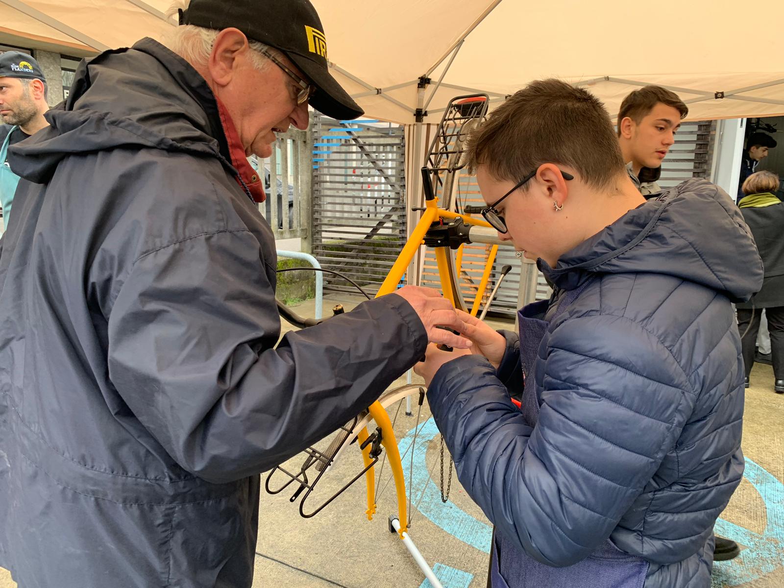 I due ex corridori, oggi consiglieri dell'Associazione Corridori Ciclisti Professionisti Italiani, sono saliti in cattedra e con i ragazzi che stanno frequentando il laboratorio In-Bike: Una nuova strada per rimontare in sella hanno ideato una bici simbolo del pedalare sicuro dai colori giallo e nero come il simbolo del "sorpasso sicuro" che ACCPI si sta battendo perchè diventi legge.
