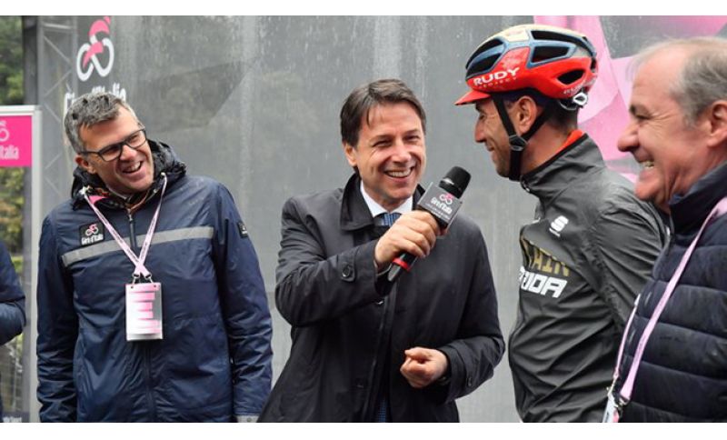 Un siparietto davvero simpatico e inatteso, quello che ci ha regalato il premier Giuseppe Conte alla partenza della tappa del Giro da Frascati. Il primo ministro, infatti, ha raggiunto la carovana per vestire i panni dello starter d'eccezione, e ha rotto il cerimoniale prendendo il microfono e intervistando Vincenzo Nibali. Lo Squalo ha risposto con simpatia alle domande puntuali del premier che ha mostrato di avere una buona conoscenza delle cose del ciclismo. «Per me è un onore e un piacere essere qui. Ho sempre seguito il Giro d'Italia e tante volte sono stato anche io tra la gente a bordo strada ad aspettare la corsa. Il Giro d'Italia è un mezzo per far conoscere la nostra Penisola. Non avrei mai penstato di salire un giorno sul podio insieme ai corridori. Un in bocca al lupo a tutti e viva il Giro d'Italia!». Rivolto ai corridori itlaiani ha poi aggiunto: «il Paese vi guarda".. Noi ci aspettiamo molto dallo Squalo... Siamo sportivi, ma tifiamo italiano» ha chiosato Conte.