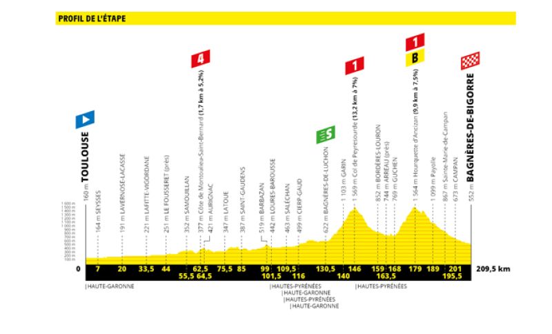 Signori, ecco i Pirenei. Comincia oggi la quattro giorni sui monti del sud della Francia: la prima tappa è la Tolosa-Bagneres de Bigorre di 209 km. È una frazione nettamente divisa in due parti: praticamente tutta pianura per 130 km fino al traguardo volante di Bagneres de Luchon e poi netto cambio di terreno, di strategie, di difficoltà.