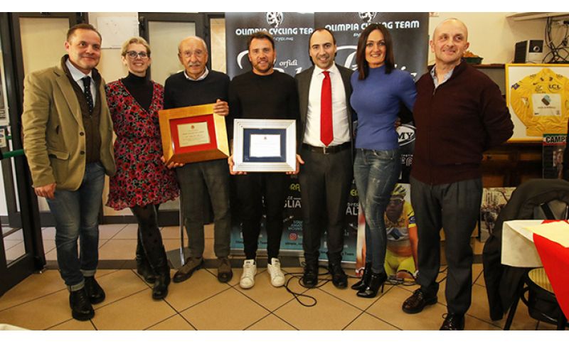 BAGNOLO DI MONTEMURLO(PO).- Al Circolo G.Gelli a Bagnolo di Montemurlo in occasione della presentazione delle due squadre 2020, quella amatoriale e quella del mountain bike, l’Olimpia Cycling Team ha consegnato per mano del sindaco di Montemurlo Simone Calamai e dell’assessore allo sport Valentina Vespi, i premi “Aldo Bini alla carriera 2019”. Bini era di Bagnolo, località pratese che ha una piazza a lui intitolata, e che ospita il monumento in bronzo che ricorda questo grande campione pratese di ciclismo. Classe 1915, morto nel giugno del 1993, in carriera vinse 22 gare con 5 tappe al Giro d’Italia, un Giro di Lombardia, medaglia d’argento al mondiale di Berna del ’36. Fu definito un campione virtuoso e monello e Alfredo Martini di lui disse che “aveva il sangue giusto per andare in bici).