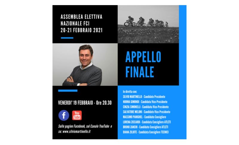 Domani sera, alla vigilia dell'appuntamento elettorale, che si terrà sabato 20 e domenica 21 febbraio a Roma, il Campione Olimpico di Atlanta 1996 chiuderà il cammino di avvicinamento all'appuntamento elettorale con una serata da trascorrere in compagnia dei componenti della sua squadra e dei sostenitori. La formula sarà quella ormai consueta della diretta streaming sulle pagine Facebook di Silvio Martinello e sul sito www.silviomartinello.it che stasera, a partire dalle ore 20.30 vedrà collegati tutti i componenti del gruppo di lavoro di Silvio Martinello: "Sarà l'occasione per chiudere insieme questo lungo percorso iniziato il 1° ottobre. Sono stati dei mesi molto intensi e molto preziosi nei quali abbiamo sviluppato il dialogo e il confronto con chi vive quotidianamente il ciclismo" ha spiegato l'ex professionista padovano. "Ritengo fosse necessario informare i tesserati e le società che compongono la base del nostro movimento nazionale dei progetti che intendevamo proporre per il rilancio della Federazione Ciclistica Italiana per consentire a tutti di avere a disposizione le informazioni necessarie per adottare sin dalle assemblee provinciali una scelta consapevole. Credo che, nonostante le mille limitazioni dovute alle norme per il contenimento della pandemia, anche grazie all'aiuto di tante persone, siamo riusciti a coprire tutto il territorio nazionale e a ravvivare il confronto sull'indirizzo che il nostro amato sport dovrà seguire per poter godere di un futuro degno della grande tradizione ciclistica che contraddistingue il nostro Paese".