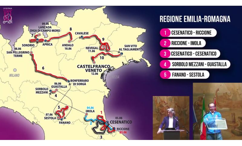 Questa mattina al Teatro Comunale di Cesenatico si è alzato il sipario sulla 44a edizione del Giro d'Italia Giovani Under 23. Marco Selleri e Marco Pavarini, con l'aiuto tecnico di Davide Cassani, hanno illustrato il percorso sul quale i migliori 176 dilettanti a livello internazionale si sfideranno dal 3 al 12 giugno 2021.