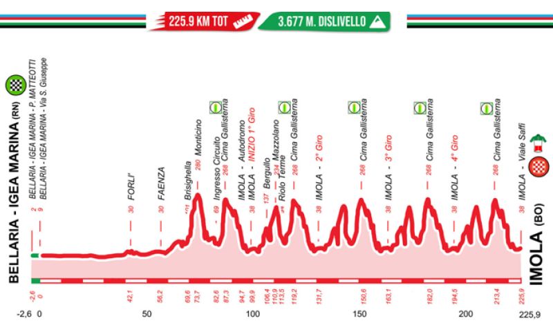 Segue l’ascesa ai m. 268 di Cima Gallisterna, ascesa portata alla ribalta internazionale dal percorso dei Mondiali 2020. La discesa conduce all’entrata dell’Autodromo imolese Enzo e Dino Ferrari e quindi raggiungere il Viale Saffi di Imola, dove è posto il traguardo di quest’edizione del campionato italiano, all’altezza della simbolica Rocca Sforzesca, imponente struttura medievale ristrutturata nel 1973, che ospita una collezione pregiata di ceramiche, tradizionale attività, e altre raccolte storiche.