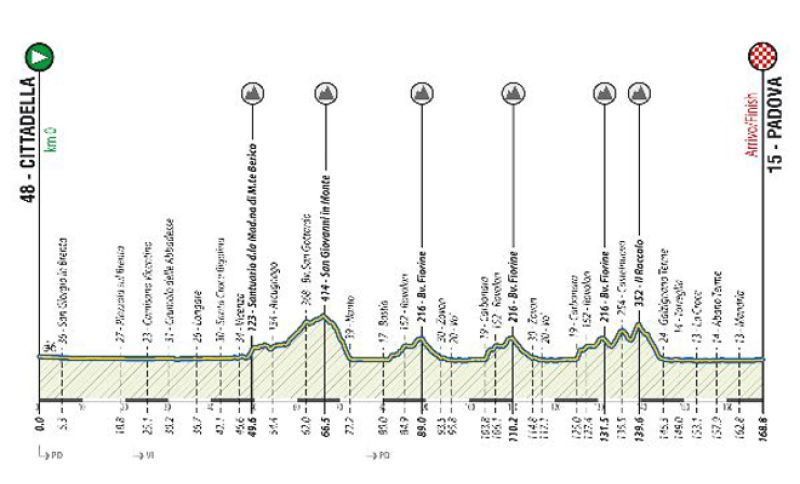 The route foresees a little less than 50 km in the beginning on flat land, where certainly there will be a "battle" between those who want to go in a breakaway. At km 46.6 the first climb towards the Sanctuary of the Madonna di Monte Berico will be followed by a climb towards San Giovanni in Monte. Descent on Nanto along the "Strada degli Olivi" and entry into the circuit (two laps with only some sections affected by 3 passages) of 21.3 km that sees the climb to the junction Fiorine the most selective section. At km 135, having passed the Fiorine junction, it turns towards the short climbs of Castelnuovo and, above all, towards Il Roccolo. Then a descent to Galzignano Terme where the final 23 km flat section begins. At 10 km to go, the passage from Abano Terme before the very last stretch towards the conquest of Prato della Valle in Padova.