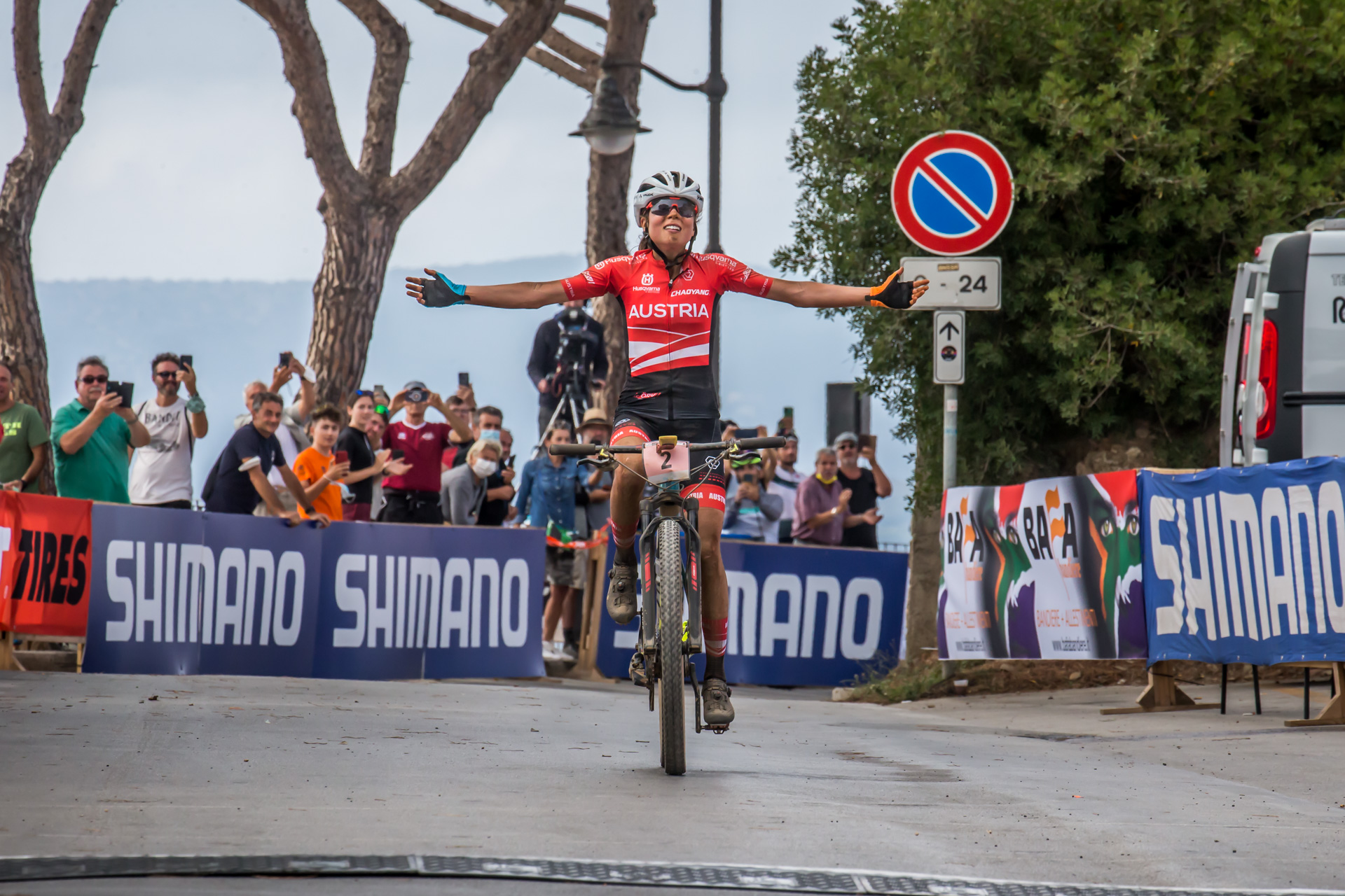 Mona Mitterwallner non aveva mai partecipato ad una gara marathon in vita sua, ma è riuscita a conquistare la maglia iridata alla prima occasione. Sull'impegnativo tracciato dell'Isola d'Elba la 19enne austriaca è stata la più forte, completando una stagione da applausi, nella quale aveva dominato nel cross country. Campionessa europea e mondiale Under 23, ha messo la sua firma in tutte le tappe di Coppa del Mondo 2021 e, alla prima prova sulle lunghe distanze, ha mostrato una volta di più di essere un talento indiscusso. Contro di lei nulla ha potuto la polacca Maja Wloszczowska, staccata di 1'13" all'ultima gara della carriera, nè la spagnola Natalia Fischer Egusquiza, terza addirittura a 7'37". Quarto posto per l'azzurra Giada Specia, nella top ten anche Marika Tovo che ha avuto un crollo a 10 km dal traguardo e dalla quinta piazza ha chiuso nona. Ben presto fuori dai giochi la campionessa uscente Ramona Forchini.