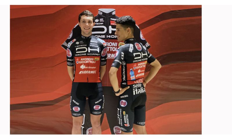 Naturally, Rosti, the Brembate sports knitwear factory, now a partner of the team for several seasons, designed and created the new uniform. The work of Giovanni and Maurizio Alborghetti, who give the team clothing made with cutting-edge material, was once again the best. Appealing and superb in style, the jersey features Drone Hopper and Androni Giocattoli, not neglecting to give the right relevance to the other brand partners of the team that appear on the uniform itself. Compromise of style and space, the jersey has everything to convince from an aesthetic point of view in the group that is now ready for the first races of the new season. Satisfaction with the launch of the new jersey, of course, by Pablo Flores, the Ceo of Drone Hopper who is the first name of the team, as well as by Androni Giocattoli, the second name of the team. The Italian company, historic training partner, spoke during the presentation with a video greeting from Mario Androni and Paolo Scolè. To accompanied the vernissage also the nice words of the rector of the Spanish university, partner of the team and of Drone Hopper, who thanked for the important synergy Marco Bellini and Gianpietro Foletti, in the speakers' table to represent the team, and Juan Hortelano, the former Spanish rider who worked so hard for the start-up of drones in cycling. Only a flight delay prevented the general manager Gianni Savio from being present. For the first photos with the new colors of jersey and shorts (black) posed Simone Ravanelli and the Venezuelan with a Spanish passport Ricardo Zurita, one of the latest additions to the team.