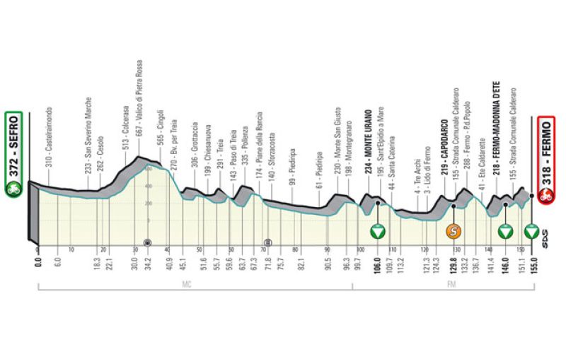 La Sefro-Fermo di 155 km è una frazione costituita da due parti distinte. La prima attraverso l’Appennino fino alle porte della provincia di Fermo e la seconda più articolata con 5 muri tra approccio all’arrivo e circuito finale. Nella prima parte si toccano Castelraimondo, San Severino Marche per salire al Valico di Pietra Rossa, cui segue la discesa su Cingoli e Treia per passare da una valle all’altra attraverso una serie di salite e discese.