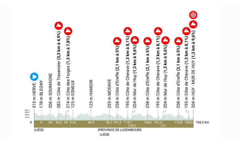 La successione della Côte d'Ereffe, della Côte de Cherave e del Muro di Huy verrà affrontata dal gruppo per tre volte: dopo il secondo giro con lo scollinamento del Muro di Huy, i corridori avranno già percorso 157,1 chilometri e ne mancheranno ancora 37 per raggiungere il traguardo.