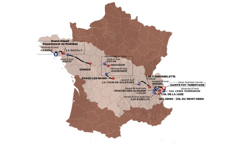 Come sempre successo nelle ultime edizioni, il percorso sarà un lento in crescendo di difficoltà, si parte dalla Bretagna e si arriva in Savoia, con le ultime 4 tappe destinate a disegnare la classifica. Si parte con la Carnac - La Gacilly di 140 km, con il circuito finale da ripetere 3 volte che presenta qualche su e giù che strizza l’occhio ai finisseurs. La seconda tappa, la Nozay - Chinon, è la più lunga di tutte con i suoi 195 km, ma è totalmente pianeggiante e perfettamente adatta ai velocisti.