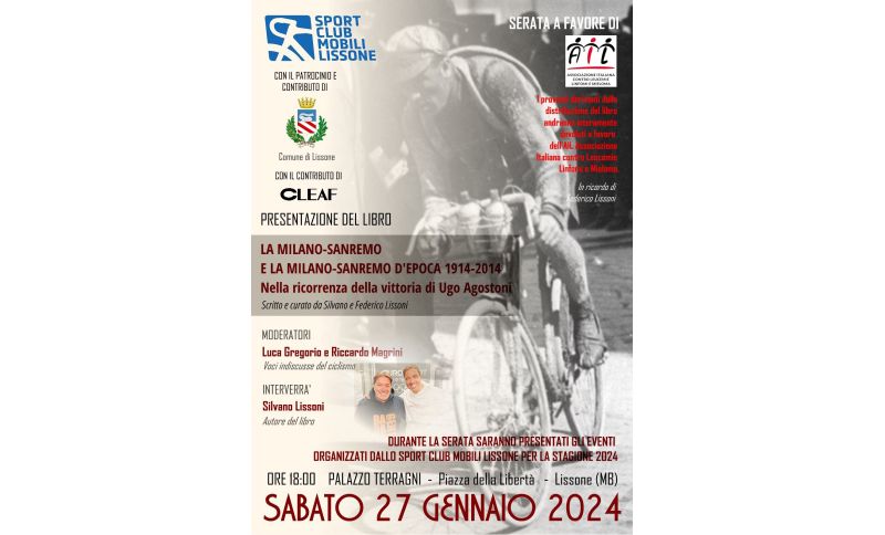 Sarà Palazzo Terragni di Piazza Libertà a Lissone ad ospitare, sabato 27 gennaio, dalle 18.00, la presentazione di “La Milano - Sanremo e la Milano – Sanremo d’Epoca 1914 – 2014”, libro scritto e curato da Silvano e Federico Lissoni.