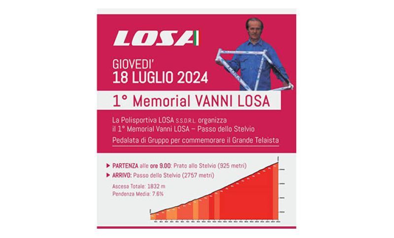 L'appuntamento è per giovedì 18 luglio a Prato allo Stelvio per il 1° Memorial Vanni Losa: una pedalata di gruppo con partenza da quota 925 metri per arrivare fin sulla vetta dello Stelvio, a quota 2.757 metri, superando un dislivello di 1.832 metri con una pendenza media del 7,6%.