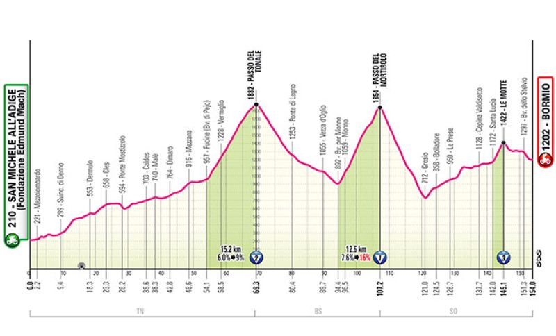 Dopo il terzo e ultimo giorno di riposo si riparte con una tappa altimetricamente molto impegnativa: la Fricca, Candriai, Vico Cavedine e Santa Barbara sono le salite da superare prima di quella finale (18 km al 6,3% con punte del 14%) che porta a San Valentino Brentonico. L’indomani, altre fatiche in una frazione più breve (154 km) con Tonale, Mortirolo (da Monno) e Le Motte prima dell’arrivo in discesa a Bormio.