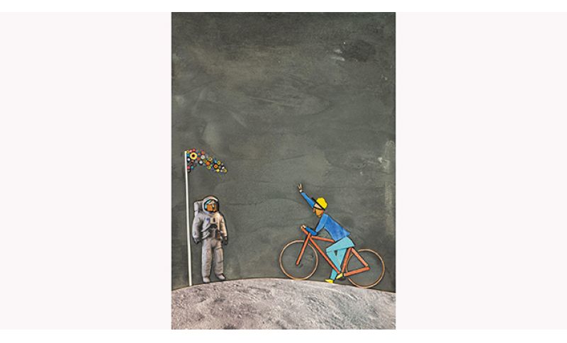 La bici come ispirazione (“Libertà, innanzitutto”), la bici come mobilità (“Abito e lavoro nel centro storico a Ravenna, ma quando mi sposto con il furgone, parcheggio e poi salgo in bici”), la bici come terapia (“Corsa e mountain bike, da solo o con gli amici, meglio sulle colline, solo per sentirmi bene”), la bici come fascino (“Lo stile, il disegno…”), stavolta Barberini dedica alla bici tutta la sua attenzione e il suo impegno: “Via Zirardini è un luogo non più per affissioni di manifesti politici ma aperto a opere d’arte. Le mie sono state fotografate e gigantografate, quindi esposte, ventiquattr’ore al giorno per trenta giorni, gli originali visibili solo domani dalle 18 all’inaugurazione”. La bici come messaggio e messaggero. Anche di pace.