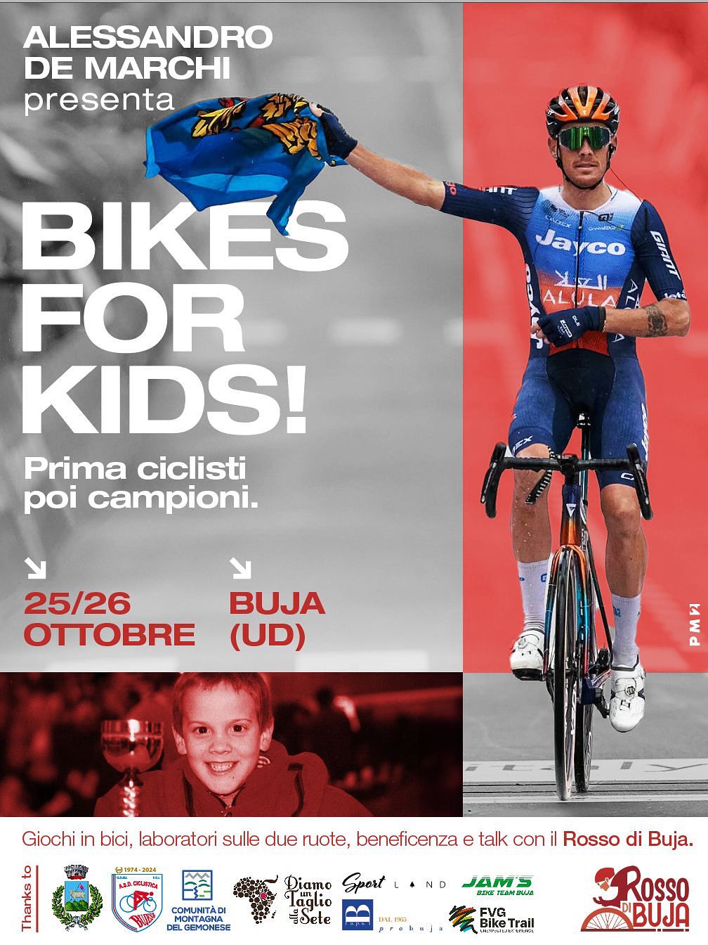 Bikes for kids! Prima ciclisti poi campioni nasce proprio dalla volontà del Rosso di Buja, nel gruppo pro' dal 2010 al 2025, di chiudere il cerchio come è nel suo stile. Vale a dire pensando agli altri e confermando il legame con le sue radici.