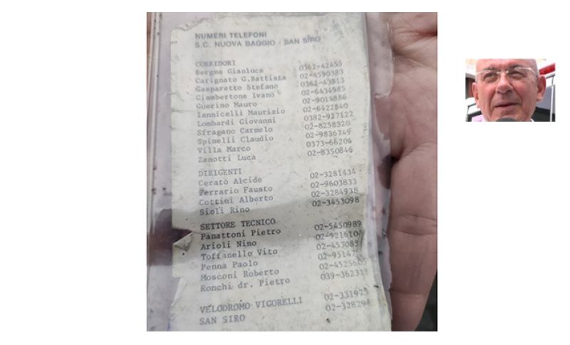 È semplicemente un elenco su un modesto e pure slabbrato cartoncino, con caratteri stampati un po’, anzi, tanto, sbiaditi del G.S. Nuova Baggio San Siro e dei suoi componenti – atleti, dirigenti e tecnici con il recapito telefonico fisso di ognuno e delle sedi sociali, la sede della Società e il numero del Velodromo Vigorelli. Oggi tale elenco con recapiti sarebbe definito “roster” con il dilagante anglicismo. I cellulari erano ancora in una fase embrionale, con annessi e connessi.