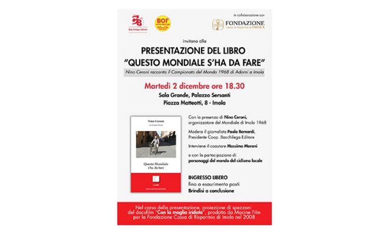 E le immagini del trionfo di Vittorio Adorni, grande amico di Ceroni, sono nella più pregiata memoria ciclistica. Qui è riprodotta la copertina del libro con il titolo “Questo Mondiale s’ha da fare” con Ceroni, ovviamente in bicicletta, per Imola e le informazioni relative alla presentazione ufficiale della pubblicazione moderata dal giornalista Paolo Bernardi, presidente de Coop. Bacchiega Editore e del coautore Massimo Marani.