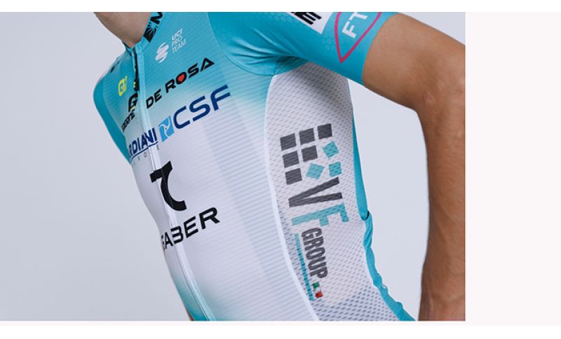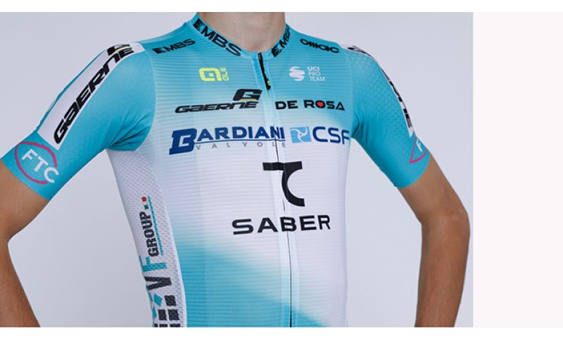 La nuova maglia riprende lo stile grafico che ha contraddistinto le ultime stagioni, mantenendo una forte coerenza visiva con l’identità del team. La principale novità è rappresentata dall’ingresso di 7 Saber, brand di abbigliamento uzbeko che diventa terzo nome ufficiale della squadra per la stagione 2026, affiancando Bardiani-CSF nella denominazione del team e trovando spazio sulla divisa.