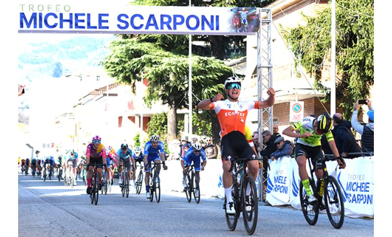 Prima vittoria stagionale per Tommaso Cingolani del Team ECOTEK Zero24 che taglia per primo il traguardo di Castelraimondo (MC) e vince la prima gara del 2°Trofeo Michele Scarponi. Una gara sentitissima per la squadra presieduta da Luigi Braghini perché, vista la forte componente marchigiana del team, riuscire a vincere sulle strade della propria regione in una gara in onore di un indimenticato campione come Michele Scarponi ha un sapore dolcissimo. Un primo posto che finalmente ripaga l'ottimo inizio di stagione della squadra coordinata da Giuseppe Martinelli oggi in ammiraglia insieme a Oscar Pellicioli e Sergio Gozio. Sì, perché se in questo 2026 non erano certo mancate le prestazioni degli atleti in maglia bianco-arancio, purtroppo non era ancora arrivata la vittoria, benchè fossero stati conquistati una sequela infinita di secondi posti (ben sei, divisi tra Arnoldi, Martinelli e lo stesso Cingolani).