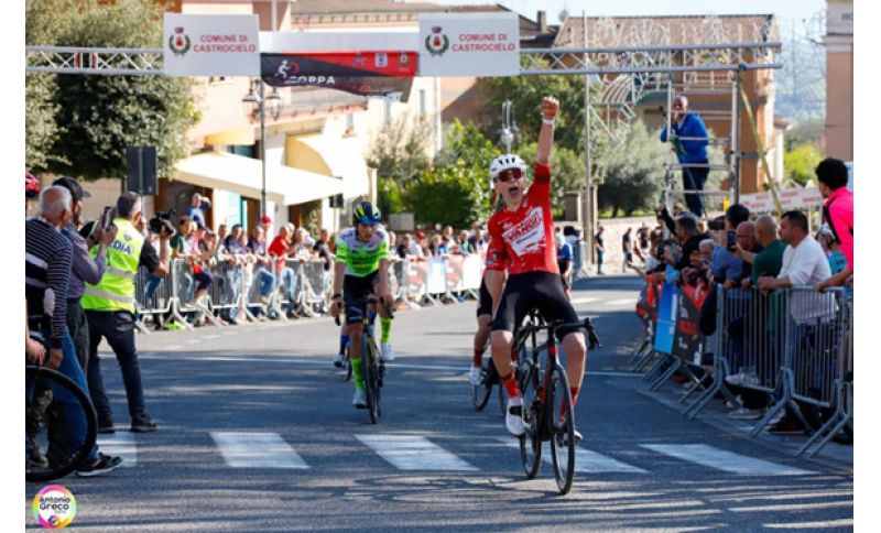E’ il toscano Marco Spanio (Team Vangi Tommasini Il Pirata) il vincitore della Coppa Palazzolo 20226, gara Juniores che si è svolta nella sua tradizionale collocazione di Pasquetta a Castrocielo. Uno spunto vincente quello del diciasettenne toscano che ha piegato la resistenza degli altri cinque compagni di fuga che avevano animato la gara nella parte finale. La Coppa Palazzolo era valida per l’assegnazione dei titoli regionali e provinciali che sono andati entrambi a Gianmaria Graziani (Team Coratti) ed era prova della challenge Oscar Tuttobici. .si conferma classica di spicco della categoria Juniores e regala una Pasquetta ricca di emozioni al folto pubblico assiepato sul rettilineo d’arrivo di Castrocielo. Primo dei battuti della gara ciociara è stato Tommaso Banini del Team Coratti che ha preceduto il compagnodi squadra Luca Fabbri. Al quarto e quinto posto si piazzavano i due CPS Professional Team Tommaso Roggi e Antonino Lucia mentre Gianmaria Graziani chiudeva sesto e si aggiudicava le due maglie regionali e provinciali per la gioia del Team Coratti. Cerimonia di premiazione alla presenza dei vertici FCI Lazio con il presidente Maurizio Brilli e il vice Tony Vernile mentre per il Comitato Provinciale Ciociaro era rappresentato dal Presidente Roberto Soave e dai consiglieri Francesca Coppola, Sebastiano Retarvi e Domenico Bartolomucci. Oltre alla maglia di vincitore della Coppa Palazzolo Marco Spanio si aggiudicava anche quella bianca D & D come miglio primo anno di giornata.