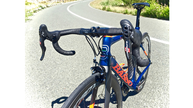 Le dotazioni di serie del modello in prova sono il meglio di casa Basso, a partire dal manubrio Microtech in carbonio fino alle ruote M150, scorrevoli, leggere e veloci. Il gruppo è un Campagnolo Super Record e i tubolari utilizzati sono dei Michelin Pro4, una delle migliori soluzioni per correre veloci e assaporare inclinazioni motoristiche lungo le curve in discesa.