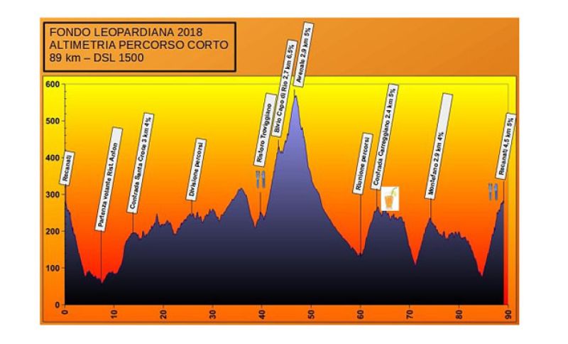 Il percorso della Mediofondo misura 89 chilometri e porterà coloro che opteranno per questo tracciato a toccare il territorio di sei comuni della provincia maceratese e affrontare 1500 metri di dislivello. La partenza alle ore 9,15 ovvero 30’ più tardi rispetto ai partecipanti che pedaleranno sul percorso della granfondo. Partenza ufficiosa da Via 1° luglio e dopo un tratto di trasferimento di 7,5 chilometri, il via ufficiale.