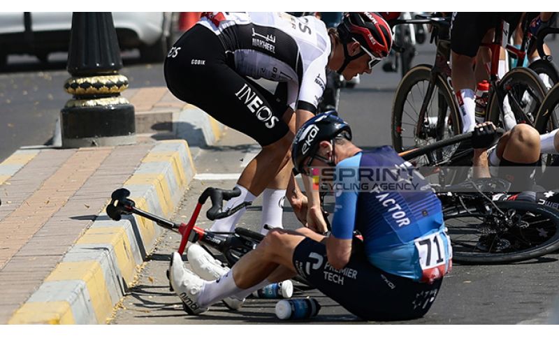 The incident occurred less than ten kilometers after the start of the seventh and final stage of the UAE Tour, with a traffic island approached at full speed causing seven riders to fall: Froome, Tarling, Behrens, Kepplinger, Rootkin-Gray, Van Hoecke and De Kleijn. Four riders managed to restart, while Chris Froome, Arvid De Kleijn (Tudor Pro Cycling) and Niklas Behrens (Visma Lease a Bike) remained on the ground and were forced to withdraw.
