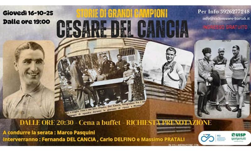Stasera (ore 19) al Museo Bartali si accenderanno i riflettori sulla figura di Cesare del Cancia, ciclista pisano di Buti. Nel ciclismo eroico degli anni ’30, in mezzo ai duelli tra Binda e Guerra, nasce una generazione di corridori toscani che farà poi la storia. Il più luminoso Gino Bartali, ma suoi coetanei sono il pratese Aldo Bini, il livornese Olimpio Bizzi, il senese Primo Volpi, il monsummanese Ezio Cecchi. Un po’ più vecchio di loro lo sciupafemmine Raffaele di Paco, un signor velocista (capace di vincere tappe al Giro e al Tour).
