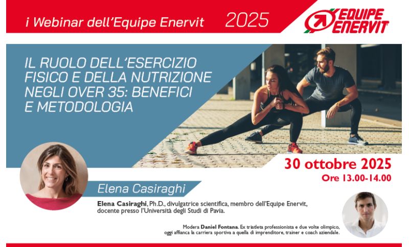Di questo parleranno Elena Casiraghi, Ph.D., divulgatrice scientifica e membro dell'Equipe Enervit, e l'ex triatleta, trainer e coach Daniel Fontana, nel webinar dell'Equipe Enervit "Il ruolo dell'esercizio fisico e della nutrizione negli over 35: benefici e motodologia" giovedì 30 ottobre dalle 13.00 alle 14.00.