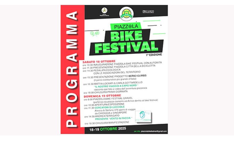 - ore 8.00 – Piazzola Bike Festival Gravel (partenza da Piazza Camerini e arrivo dentro al Bike Festival)
