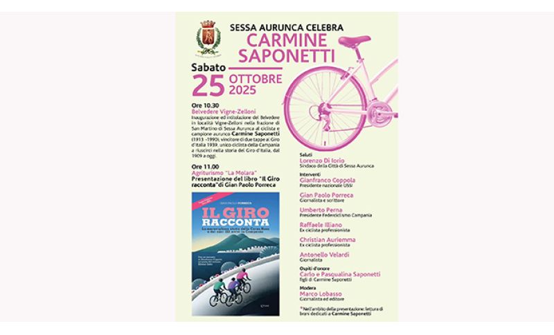 Metti un sabato mattina per parlare di storia del ciclismo, di Giro, di Campania, di passione e da lì volare dritti nel futuro. È quanto accadrà sabato a Sessa Aurunca con le celebrazioni dedicate a Carmine Saponetti, il solo ciclista campano della storia capace di vincere due tappe al Giro d’Italia.