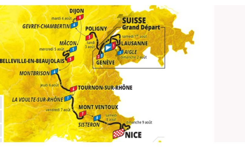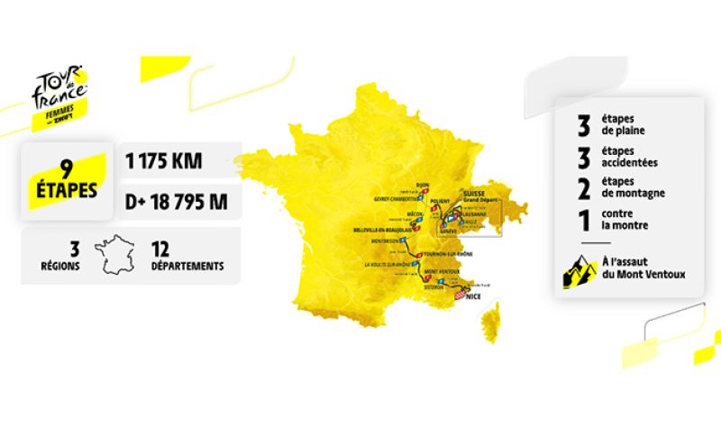 Prima di affrontare il Gigante di Provenza, le atlete del Tour de France Femmes avec Zwift convergeranno in Svizzera per una serie di tappe che riflettono la voglia di variare le sfide: le atlete più esplosive si esprimeranno nella prima tappa a Losanna, prima di lasciare la scena alle velociste nella seconda tappa, da Aigle a Ginevra. Le cronometriste saranno protagoniste nella quarta tappa, una corsa contro il tempo di 21 km in Borgogna, che decreterà anche i veri pretendenti al titolo. Il gruppo respirerà il giorno successivo nella quinta tappa, una corsa tra le colline del Beaujolais, ma il momento della verità arriverà nella sesta tappa, il 7 agosto, quando il gruppo attraverserà Bédoin per poi affrontare la salita di 15,7 km che porta alla stazione meteorologica sul Mont Ventoux. Tuttavia, il Monte Calvo potrebbe non avere l'ultima parola, con la Maglia Gialla ancora soggetta a cambiare spalla nei due arrivi a Nizza (tappe 8 e 9), in particolare nell'ultimo giorno, che prevede quattro salite del Col d'Èze prima del traguardo sulla Promenade des Anglais.