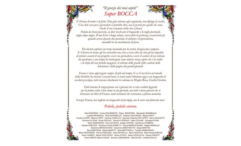 Al raduno conviviale hanno partecipato numerosi amici e colleghi di Franco Bocca, nonché parecchi pedalatori di varie epoche, capeggiati dalle due “icone” del ciclismo piemontese Franco Balmamion e Italo Zilioli. Tutti i presenti, al microfono di un Sandro Brambilla in inedita versione “light sprint”, hanno proposto rapidi aneddoti e ricordi assortiti legati alla loro frequentazione con il festeggiato.