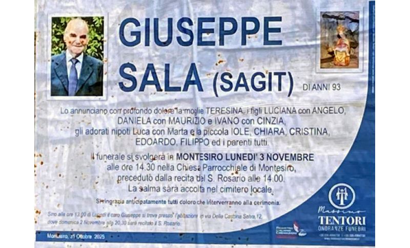 Squadra di giovani che ha conquistato pure una tappa al Giro d’Itali 1969, la Follonica-Viterbo, con Franco Cortinovis. Varie e notevoli le attività svolte da Giuseppe Sala nell’ambito del territorio. L’epigrafe qui proposta riporta i dati del funerale che avranno luogo domani, lunedì 3 novembre.
