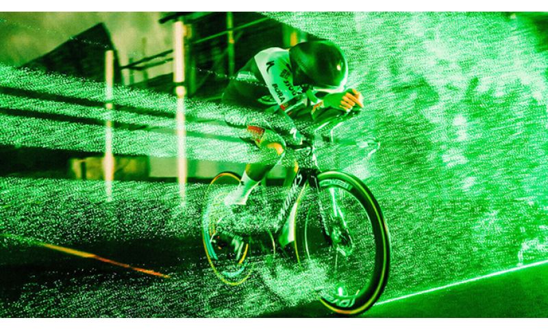 Raggi laser verdi fendono l'oscurità, rivelando il vero flusso dell'aria. Red Bull – BORA – hansgrohe, insieme a Specialized e LaVision, stanno portando i test aerodinamici a un nuovo livello.