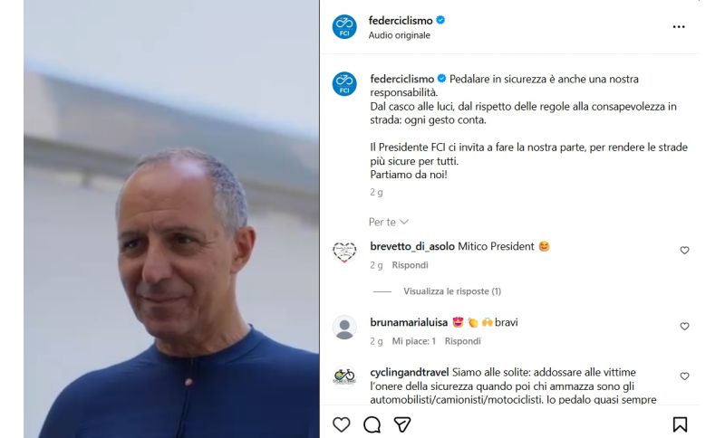 Questo, in sintesi, l'invito del numero 1 della FCI Cordiano Dagnoni diffuso attraverso i canali social della Federciclismo: un video sicuramente inusuale, un presidente federale che mette la faccia in prima persona su un tema delicato e a tratti drammatico come i pericoli che vive ogni giorno chi pedala sulle strade del nostro Paese.