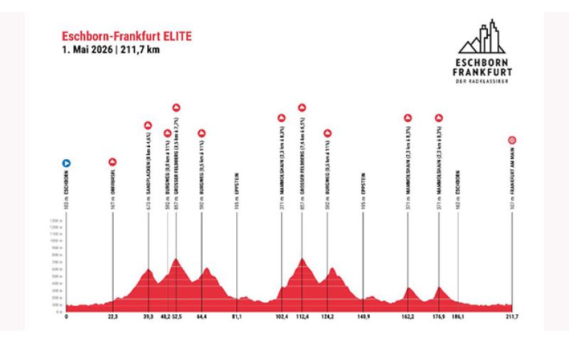 Il primo cambiamento riguarda il via: a causa dei lavori di costruzione nella piazza del municipio, la zona di partenza di Eschborn si sposta a Eschenplatz. Poi, basta uno sguardo al profilo del percorso: questa è una gara senza pause. Nel 2026, l'Eschborn-Francoforte presenta un percorso costantemente impegnativo, dove ogni salita e ogni sezione caratterizzano la gara.