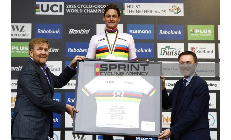 L’olandese è arrivato a Hulst da campione uscente ed andato via con una maglia celebrativa, sulla quale è stato scritto il numero 8 e i titoli vinti nel 2015, 2019, 2020, 2021, 2023, 2024, 2025 e 2026. Mathieu è senza dubbio il campione perfetto, che sul palco di Hulst ha ricevuto la maglia iridata dalle mani di Re Guglielmo Alessandro e dal presidente dell’Unione Ciclistica Internazionale David Lappartient.