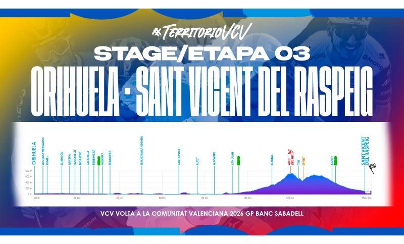 Un po’ più complicata da leggere è la terza tappa, la Orihuela - San Vicente del Raspeig di 158 km: nel finale va infatti affrontato l’Alto de Tibi (7,5 km al 5%) e subito dopo uno strappo verso il Collado de la Horna (2,2 km al 6,2%), al termine del quale mancheranno una trentina di chilometri. Non è da escludere che possano resistere anche gli uomini veloci, ma molto dipenderà da come verranno affrontate queste salite.