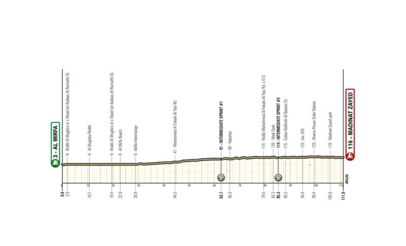 Ed eccoci all’ultima frazione, la Al Ain Hazza Bin Zayed Stadium / Jebel Hafeet. La guida al percorso indica che la tappa si svolgerà sulla distanza complessiva di 156 chilometri ma saranno gli ultimi 10 quelli impegnativi e decisivi, con una salita che tocca pendenze massime dell’11%.