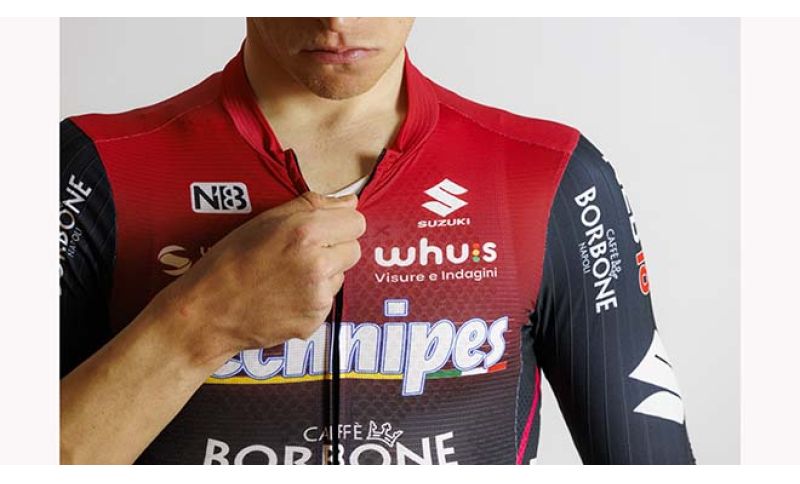 L'abbigliamento da gara è firmato NEB18 (Never Ending Brave), partner tecnico che si conferma al fianco del team con materiali di alta qualità. La maglia Kona Plus è caratterizzata da un taglio aerodinamico e vestibilità slim per performance ad alto livello. Realizzata con tessuti elasticizzati di ultima generazione e pannelli laterali in mesh, garantisce un'ottimale traspirazione durante gli sforzi più intensi. Le maniche aero presentano una costruzione ingegnerizzata con posizionamento delle cuciture studiato per ridurre la resistenza aerodinamica alle velocità di gara, mentre il taglio vivo delle maniche e l'elastico al fondo maglia dotato di silicone interno assicurano perfetta aderenza al corpo. La tripla tasca posteriore permette di riporre tutto l'essenziale durante le uscite.