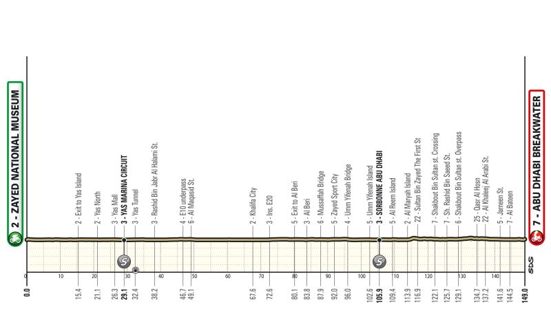 L’ultima frazione si svolgerà interamente ad Abu Dhabi, con partenza dallo Zayed National Museum, passaggi davanti alla Grande Moschea e al circuito di F1 di Yas Marina, e arrivo al Breakwater dopo 149 km, dove andrà in scena un’ultima, elettrizzante, volata.