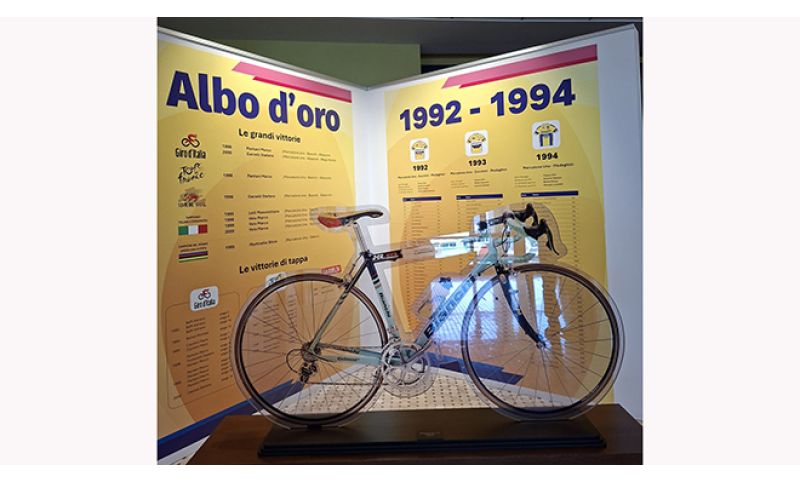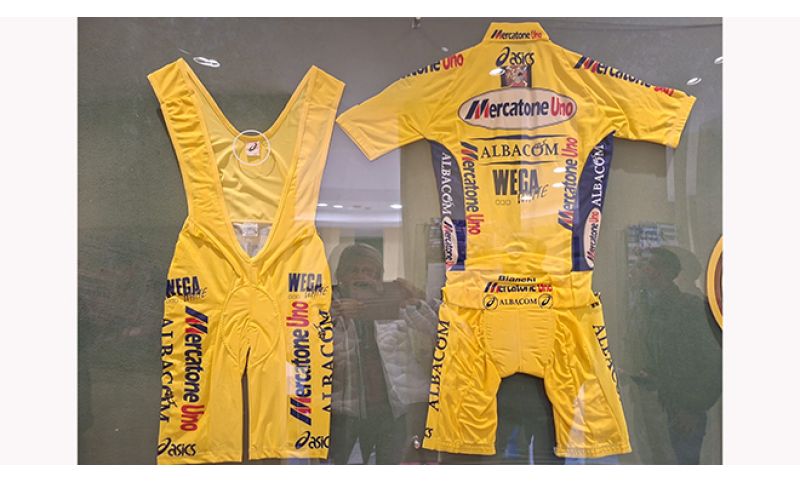 Un allestimento incredibile, ricco di amore e cimeli, che inizia dalle bandane di Marco, e termina con le parole di Gianni Mura. Maglie, biciclette, Gazzette, frigorifero. Germanvox-Wega e Mercatone Uno. Tutta questa meraviglia è visitabile gratuitamente. Parola d’ordine per entrare : “io amo il Ciclismo”. Tanto può l’amore, anche quello per un padre che se lo è meritato.