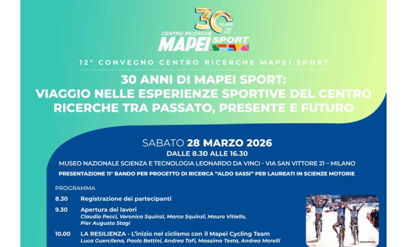 30 anni di Mapei Sport: viaggio nelle esperienze sportive del centro ricerche tra passato, presente e futuro. Questo è il titolo del prossimo convegno del Centro Ricerche Mapei Sport di Olgiate Olona (Varese) che quest'anno festeggia 30 anni di attività con una giornata ricca di interventi qualificati e campioni di varie discipline.