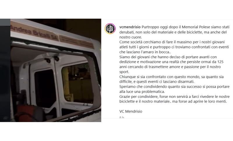 Un breve video che mostra il finestrino del pulmino rotto, immagini brutte e tristi che raccontano della triste disavventura del Velo Club Mendrisio ieri al Memorial Polese. «Purtroppo oggi dopo il Memorial Polese siamo stati derubati, non solo del materiale e delle biciclette, ma anche del nostro cuore» si legge nel post pubblicato sui profili social della squadra nella tarda serata di ieri.