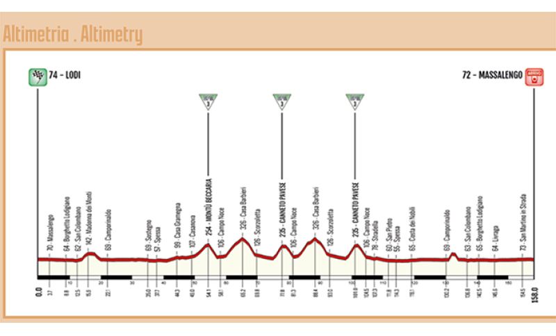 Dopo la partenza da Lodi (ore 11:45) la prima sezione, di circa 45 chilometri, sarà prevalentemente pianeggiante e scorrevole, fatta eccezione per la breve ascesa verso la collina di San Colombano.