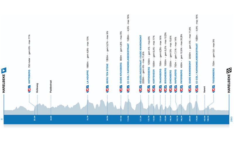 Partenza alle 12.45 e arrivo a Harelbeke dopo 208 chilometri, 16 Muri e 9 settori di pietre: un mix spietato di tratti in pavé, salite esplosive e passaggi tecnici dove ogni metro conta, ogni attacco ha un significato e ogni secondo può fare la differenza, e non è un'esagerazione. Il dislivello totale è aumentato da 2800 a 3000 metri, la corsa è più lunga di circa cinque chilometri e, soprattutto, il finale è più impegnativo. Anche per ragioni pratiche: qui non c'è la gara femminile ma quella juniores che l'anno scorso, a un certo punto, ha rischiato di sovrapporsi alla corsa WorldTour. Per evitare quel "momento di ansia", il passaggio attraverso Geraardsbergen è stato cancellato: si percorre la Paddenstraat direttamente verso La Houppe, la seconda salita di giornata. Un'altra novità è che la Karnemelkbeekstraat (ribattezzata E3-Col) e il Vecchio Kwaremont dovranno essere affrontati due volte, anche se quest'ultimo da due strade diverse. E al secondo giro si ripropone la combinazione con il Paterberg, come al Giro delle Fiandre. Il Vecchio Kwaremont si incontra dopo 121 e 169 chilometri, l'E3-Col per la prima volta dopo 113 e di nuovo dopo 176 chilometri. A quel punto mancherà solo il Tiegemberg, sedicesima e ultima salita, a 19 km dal traguardo classico di Harelbeke nelle vicinanze dello Stadio Forestier.