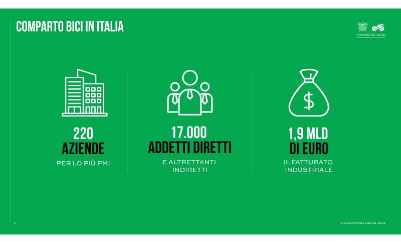 Emerge la difficoltà dei negozi specializzati, schiacciato dalla crisi generalizzata, dalla concorrenza dei canali on-line e dall'invasione incontrollata delle "finte bici elettriche che di fatto sono dei motorini". A ciò si aggiunge una cultura italiana che ancora considera la bici un mezzo di svago, sport e tempo libero, ma non ancora come un mezzo di trasporto analogo a tutti gli altri. Si conferma la tendenza del nostro Paese a essere un grande esportatore, con una bilancia commerciale che si mantiene oltre i 170 milioni di euro all'anno: frutto di un'industria ciclistica che conserva la propria eccellenza, con l'export delle biciclette tradizionali che fa registrare il +11% e l'export della componentistica che tocca il 14,5%.