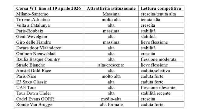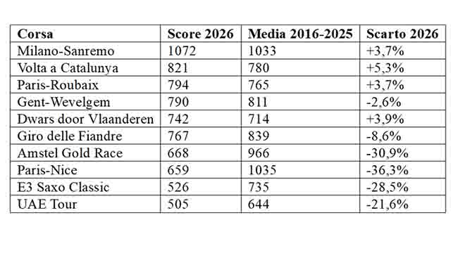 La stessa dinamica si osserva, con intensità persino maggiore, a Paris-Nice: 659 punti nel 2026 contro 868 nel 2025, 957 nel 2024, 981 nel 2023 e 1182 nel 2022. Anche l’E3 Saxo Classic scende a 526 punti, dopo valori recenti di 691 nel 2025, 734 nel 2024 e 853 nel 2023. Non siamo, quindi, davanti a una perdita indistinta di prestigio, ma a una polarizzazione selettiva: alcune corse assorbono ancora i grandi attrattori del ciclismo mondiale, altre subiscono la programmazione più scientifica dei leader e delle squadre.